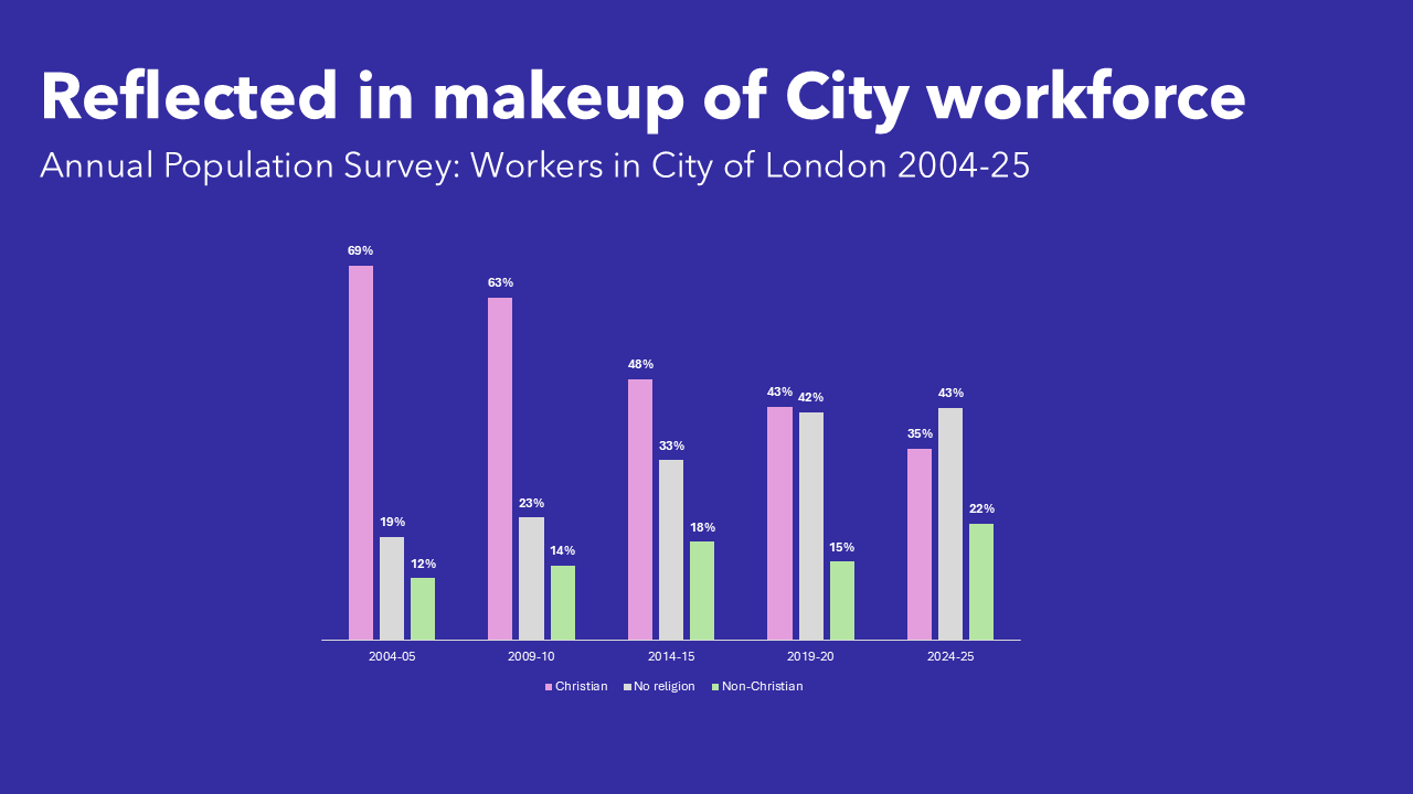 The City of London has a unique community with unique faith and belief perspectives and needs. In addition to its 8,600 residents, the City community encompasses 678,000 workers – drawn from diverse communities across London, the UK and around the world. City workplaces are eager to support staff of all faiths, and rely on a wider ecosystem and community to do so.