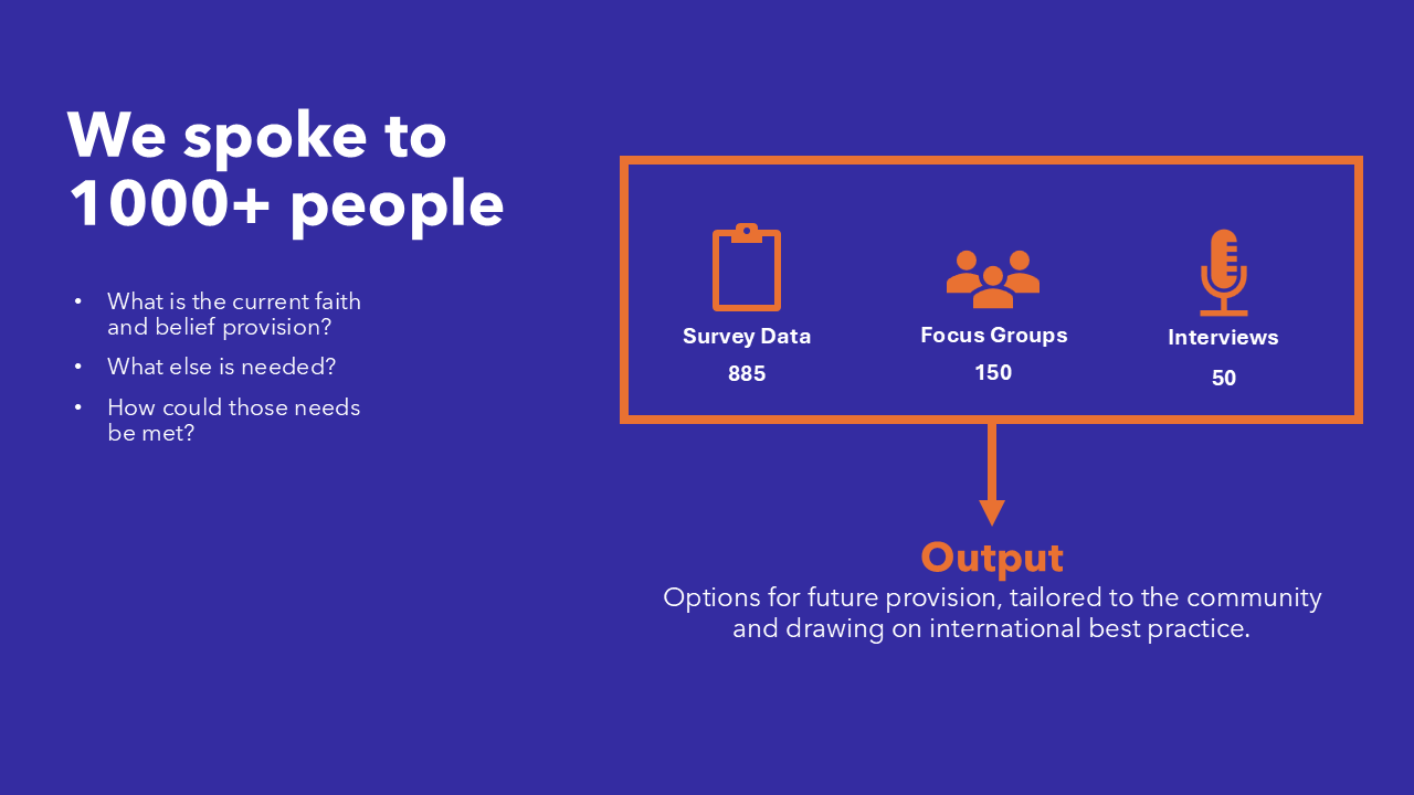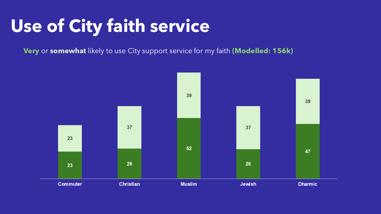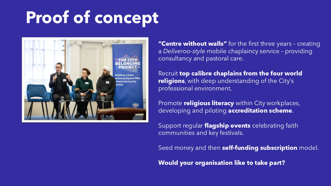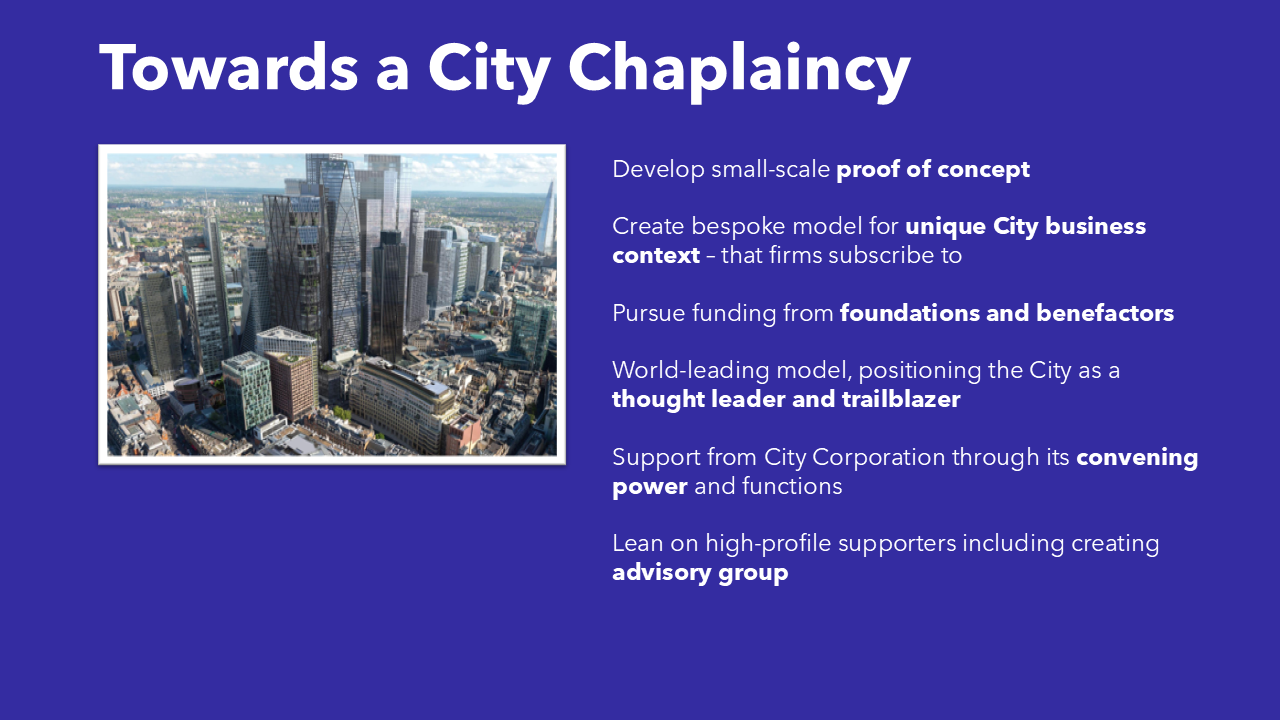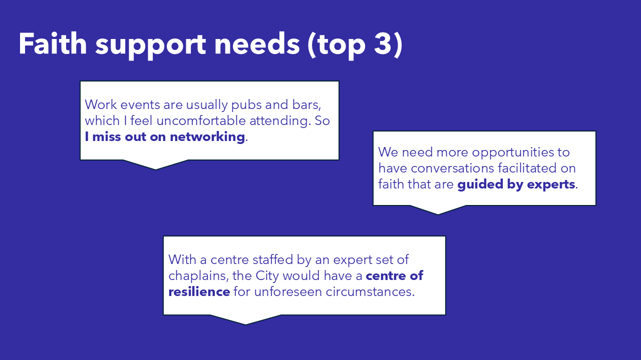 Crucially, this project will put forward and consult on potential options for future provision. University campuses, Canary Wharf, Heathrow Airport and others have multi-faith chaplaincy provision, including physical premises. As one of the largest and most international business centres in the world, it is hoped to learn from best practice globally and create world-leading solutions that match the needs of our community.