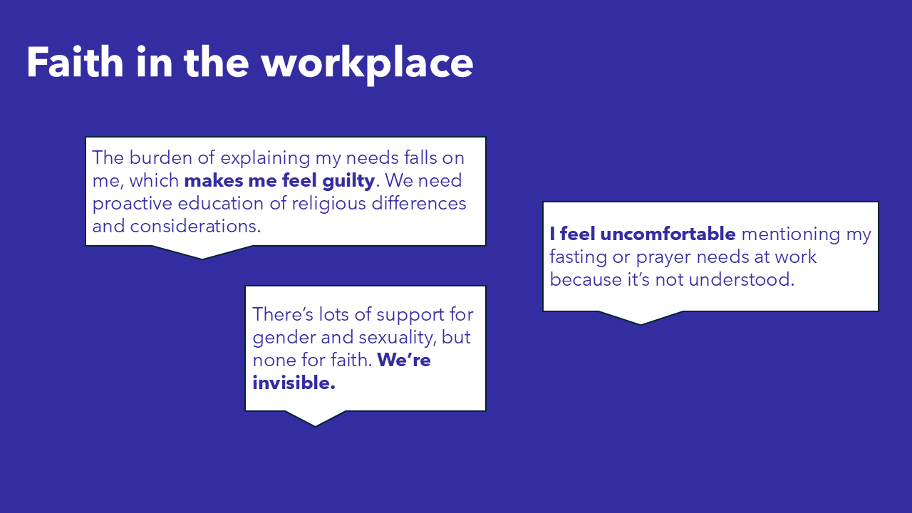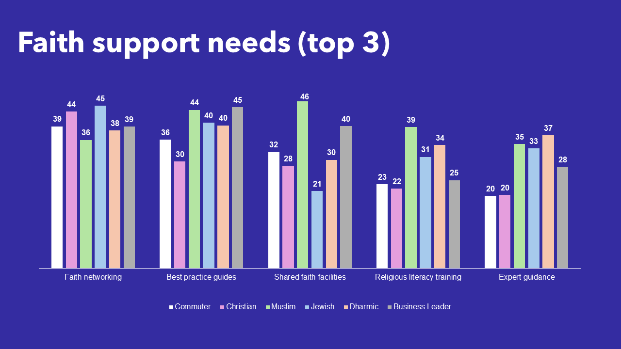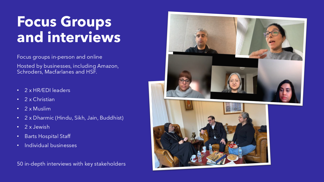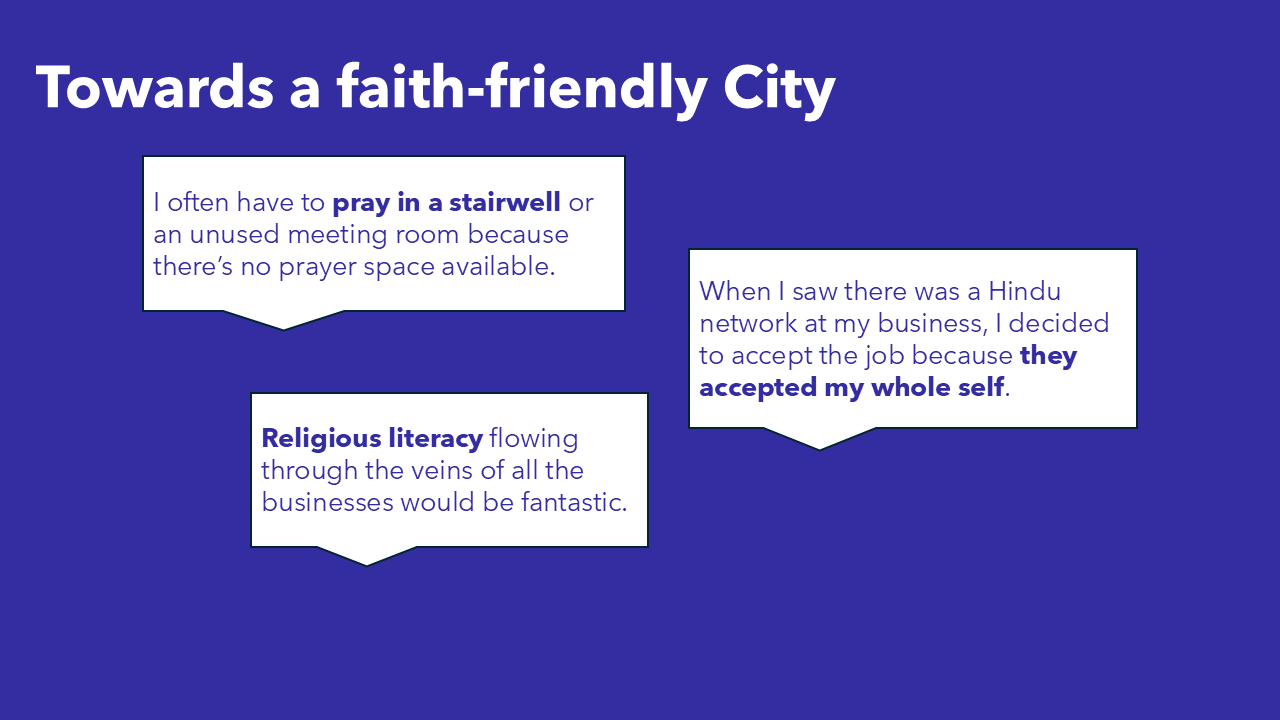Larger City businesses often have their own faith networks – including groups for individual faiths. Their prevalence and the support they receive needs to be explored. We aim to increase the confidence with which corporate leaders feel able to deal with faith matters – identifying challenges and opportunities for improved support and information. This work will also support the City of London Corporation in the development of City Belonging Networks for faith groups across the Square Mile.